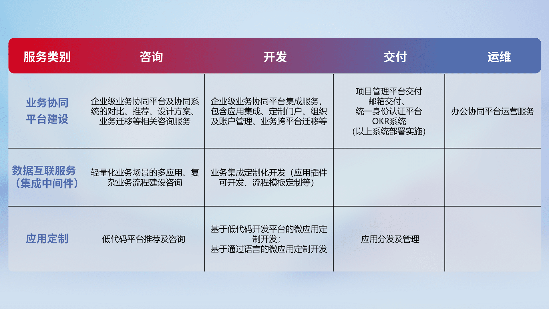 针对钉钉、、企微、、、IDaas等平台级产品提供产品的规划、、、方案、、、交付、、定制化开发等服务,,,,实现如统一协同办公、、、、智能客户服务、、混合会议管理、、、、智能数据查询、、、、等业务场景,,,实现数字化转型。。。